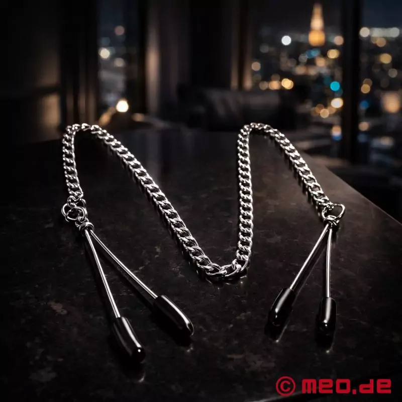 坚固的金属链将两个乳头夹 (rǔtóu jiā) 连接起来,扩大了应用范围。它可用于提供有针对性的刺激、牵引或附加重量。