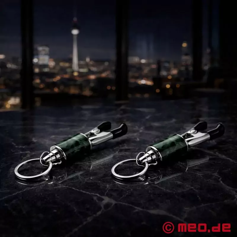 乳头夹 (rǔtóu jiā) 采用闪亮的金属、黑色夹头和绿色装饰元素,给人留下深刻印象。