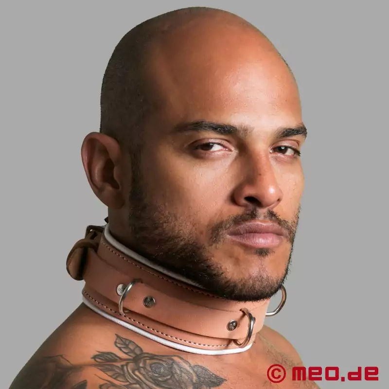 Dr. Sado®® x MEO "团队采用了特别柔软的鞋面皮革作为鞋领的填充物,穿着极为舒适。得益于精湛的做工,该鞋领可以长时间舒适地佩戴,甚至过夜也不会感到不适。三个钢环,一个在前面,两个在两侧,让您可以将项圈完美地融入捆绑训练中,例如用于连接铁链或绳索。