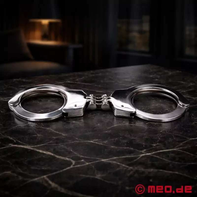无论您是初学者还是新手,我们的不锈钢手铐都是每套 BDSM 基本装备的必备配件。佐渡博士的手铐设计坚固厚重,给人一种绝对控制和完全安全的感觉。