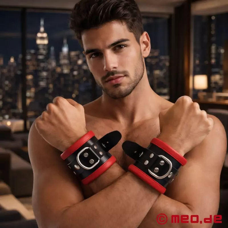 Distinct™ 皮革手铐,带衬垫,黑色/红色,由 MEO® 设计