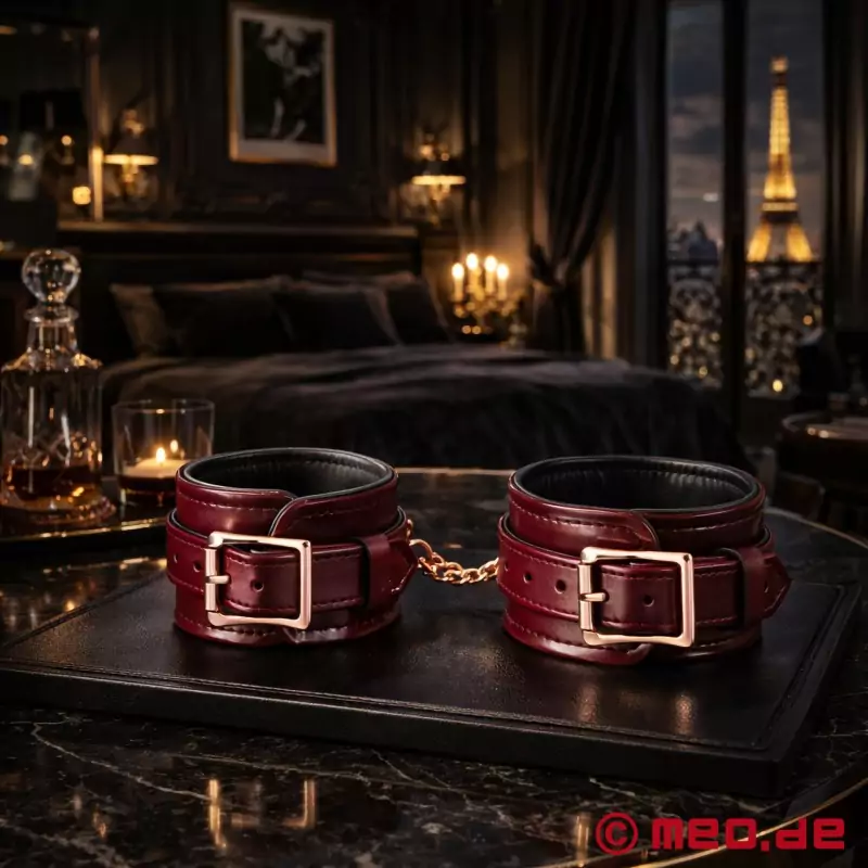 手铐采用可调节扣件,可以快速戴上并调节到合适的位置。带扣钩的坚固链条将手铐牢牢固定在一起,但也可以完全取下。日本牛皮、玫瑰金色的搭扣和铆钉特别耐磨,使手铐不仅是捆绑时的装饰配件,也适合长时间的 BDSM(性虐)会话 (BDSM huìhuà) 使用。得益于精细的做工和柔软的羔羊纳帕皮衬里,手铐可以保持较长时间,而不会让 Sub 感到太不舒服。手铐上有 3 个 D 形环,用于安装连接链或其他配件,如绳索、时间锁或链条。