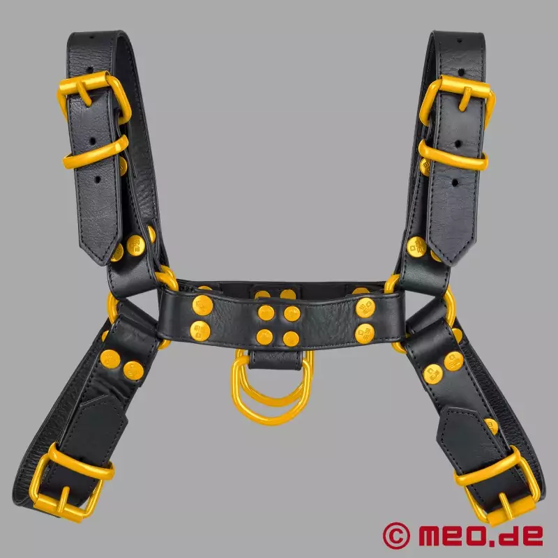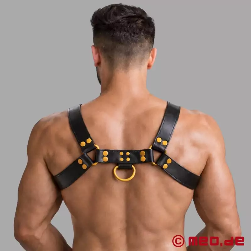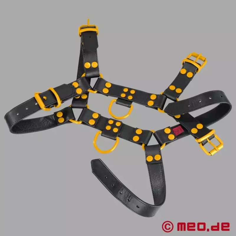 MEO® 这款黑黄相间的皮革吊带 (pígé diàodài) 是想要自信地展示自己性取向的人的首选。黑黄相间的 FetishGear™ 座袋以其黄色细节彰显阳刚之气,毫不妥协,专为强烈的表演而设计。