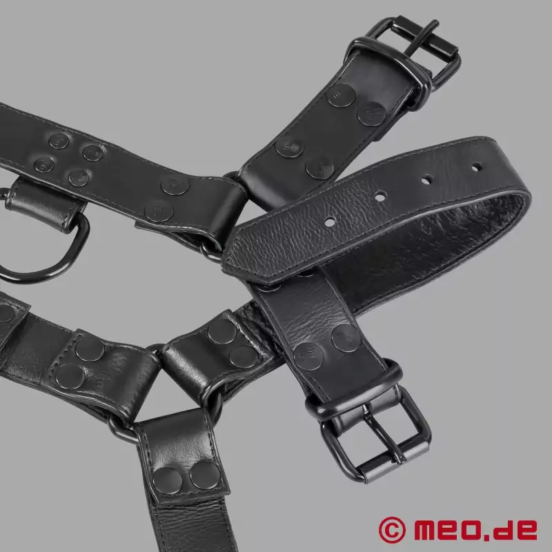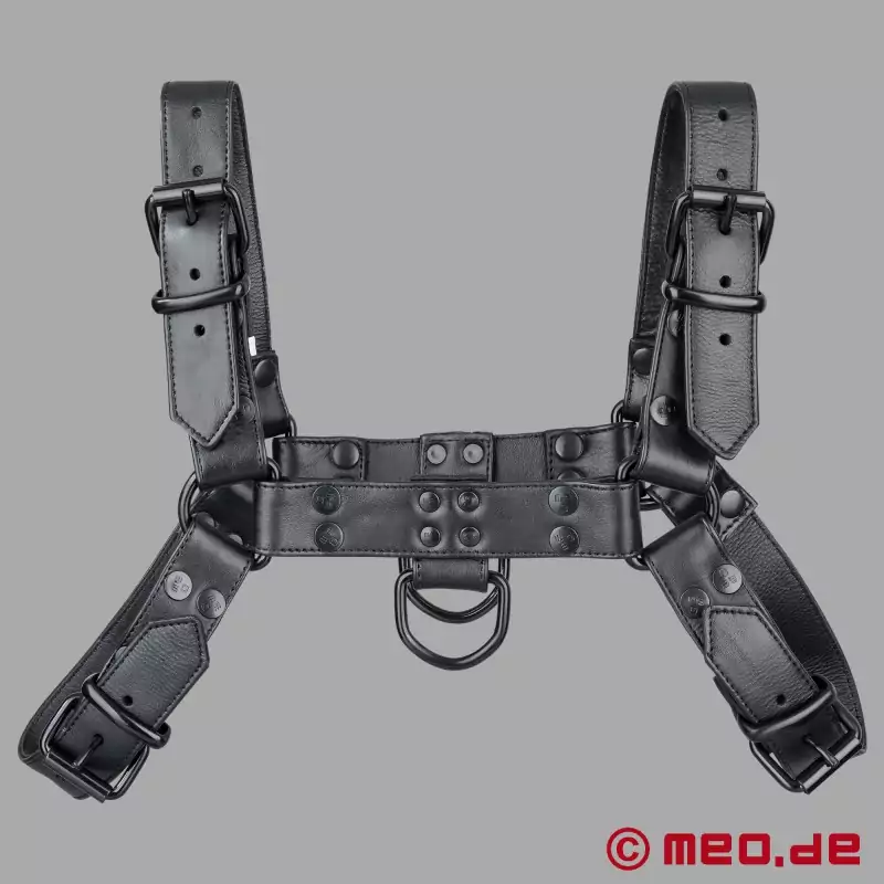 The Fetish Gear Harness in full black by MEO® Germany embodies pure dominance and understated power. Crafted from triple-layer calf leather and solid steel hardware, this upper body harness turns your chest and shoulders into a statement of control. Whether at a private dungeon or a public play event, its all-black design demands attention - without saying a word. Perfect for those who appreciate the timeless elegance of black-on-black gear that speaks pure authority.