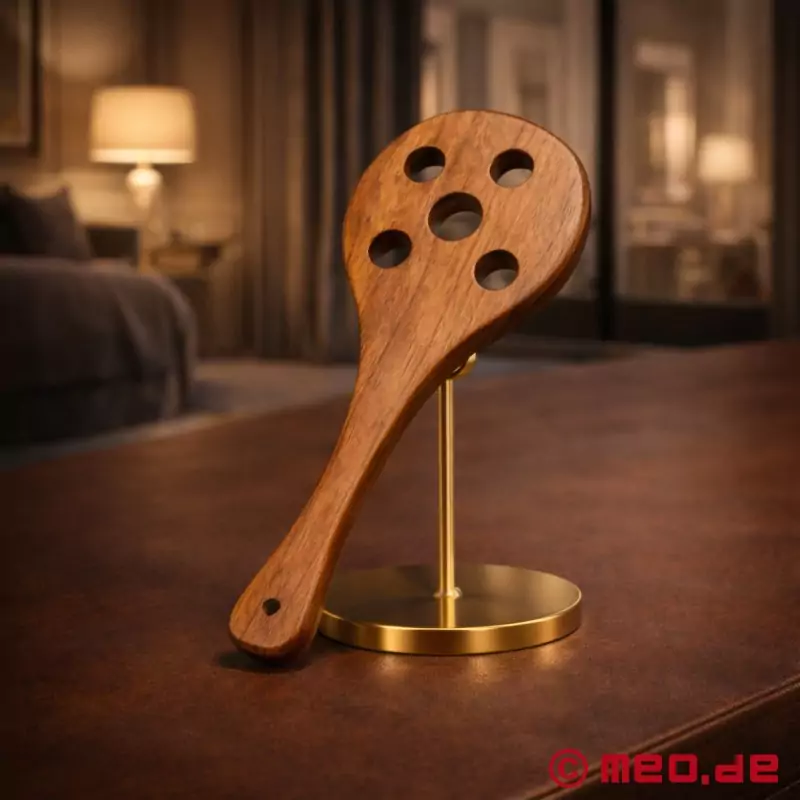 Das klasssische Spanking Paddle aus Holz eignet sich sowohl für fortgeschrittene Spanking-Freunde als auch für Anfänger. Alle Kanten sind gerundet, was die Verletzungsgefahr minimiert. Durch den ergonomisch geformten Griff liegt das Paddle sehr gut in der Hand und garantiert ein sicheres und präzises Schlagen. Das Paddle verfügt über Öffnungen und erzielt somit eine höhere Schlagwirkung als ein Paddle ohne Öffnungen.