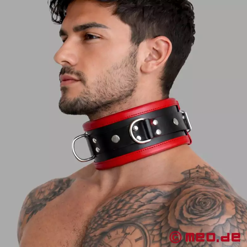 皮革束缚项圈 - 黑色和红色 - 德国 MEO™ 公司 Distinct™ 系列 BDSM 项圈。