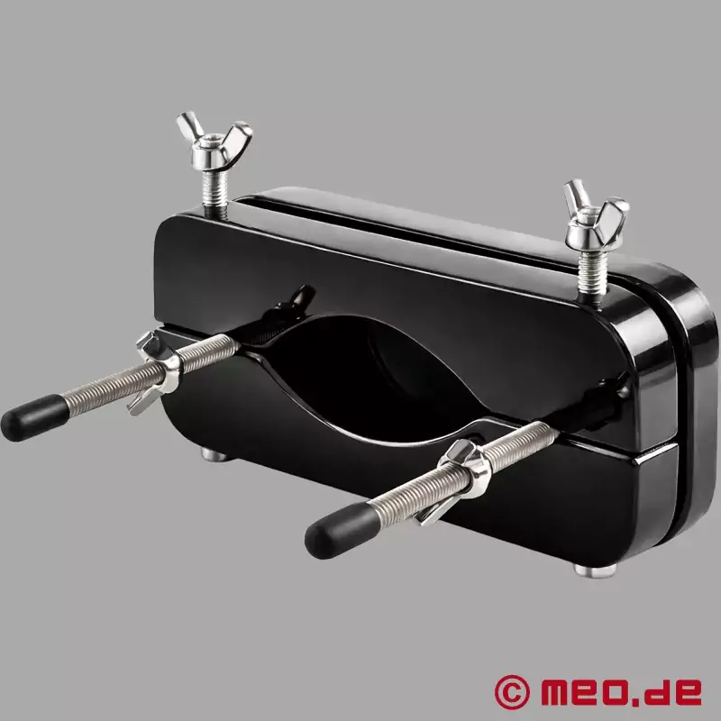 佐渡博士的黑色睾丸按压器由一个底板和一个用作挤压器的压力板组成。两块板将敏感的睾丸紧紧压在一起,从而确保达到强烈的性高潮。压力可通过两个翼形螺丝进行单独调节!每转一圈,效果和快感都会增加。您还想要什么呢?
