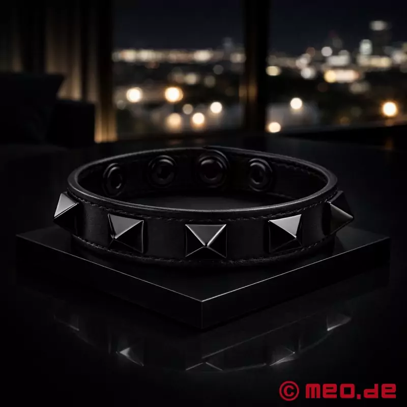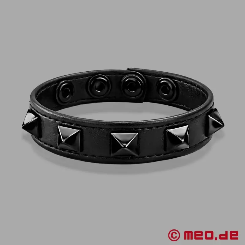 镶有黑色金字塔铆钉的黑色 Cock Ring 不仅美观大方,还能确保在性爱中获得持久的快感。