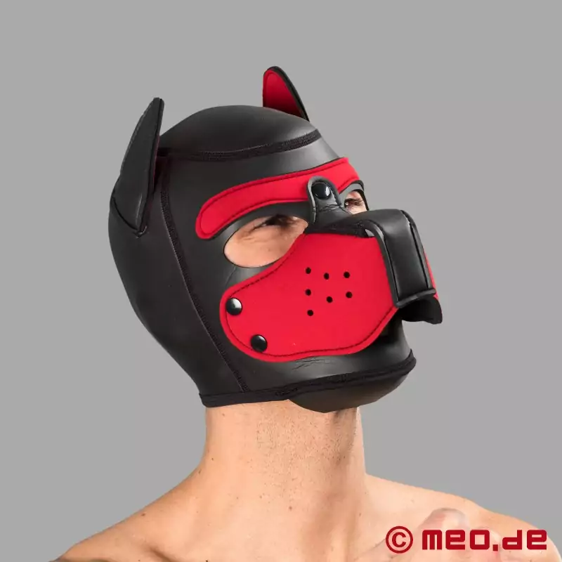 Bad Puppy 推出的黑红相间的狗狗面具向您传递一个明确的信息:霸气、活力和俏皮。四只爪子和高高翘起的尾巴让这款面具充满了活力。柔软而有弹性的氯丁橡胶狗面具可以完美地戴在头上,而不需要恼人的拉链或后面的系带。它是任何认真对待人类 Pup Play 角色的人的理想选择。